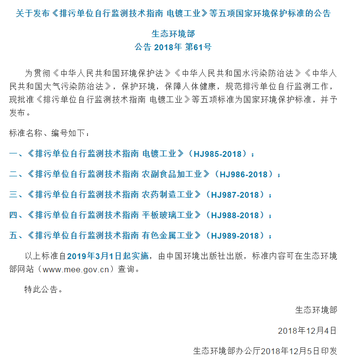 關(guān)于發(fā)布《排污單位自行監(jiān)測技術(shù)指南 電鍍工業(yè)》等五項國家環(huán)境保護(hù)標(biāo)準(zhǔn)的公告