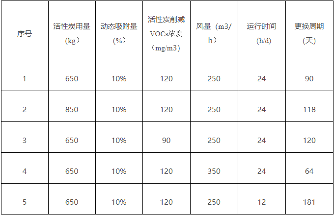 計(jì)算示例:下表中,后四組分別對(duì)第一組數(shù)據(jù)的活性炭用量、活性炭削減VOCs濃度、風(fēng)量、運(yùn)行時(shí)間進(jìn)行改變,得出不同的更換周期。