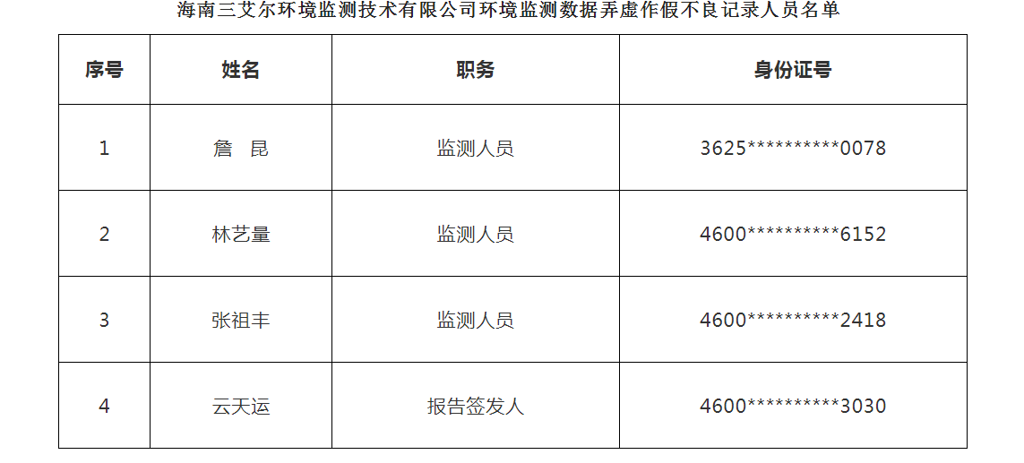 海南省生態(tài)環(huán)境廳關(guān)于海南三艾爾環(huán)境監(jiān)測技術(shù)有限公司及相關(guān)人員環(huán)境監(jiān)測數(shù)據(jù)弄虛作假行為處理意見的函